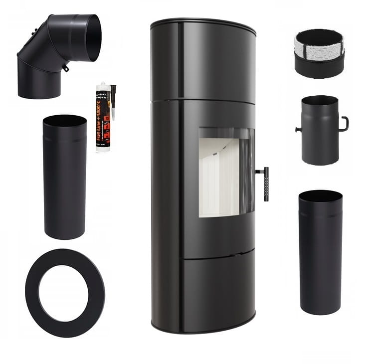 Zestaw 3: Piec wolnostojący Koza Rolloz krążkami akumulacyjnymi, termotec, wylot spalin fi 150 + dolot, moc 7kW + akcesoria