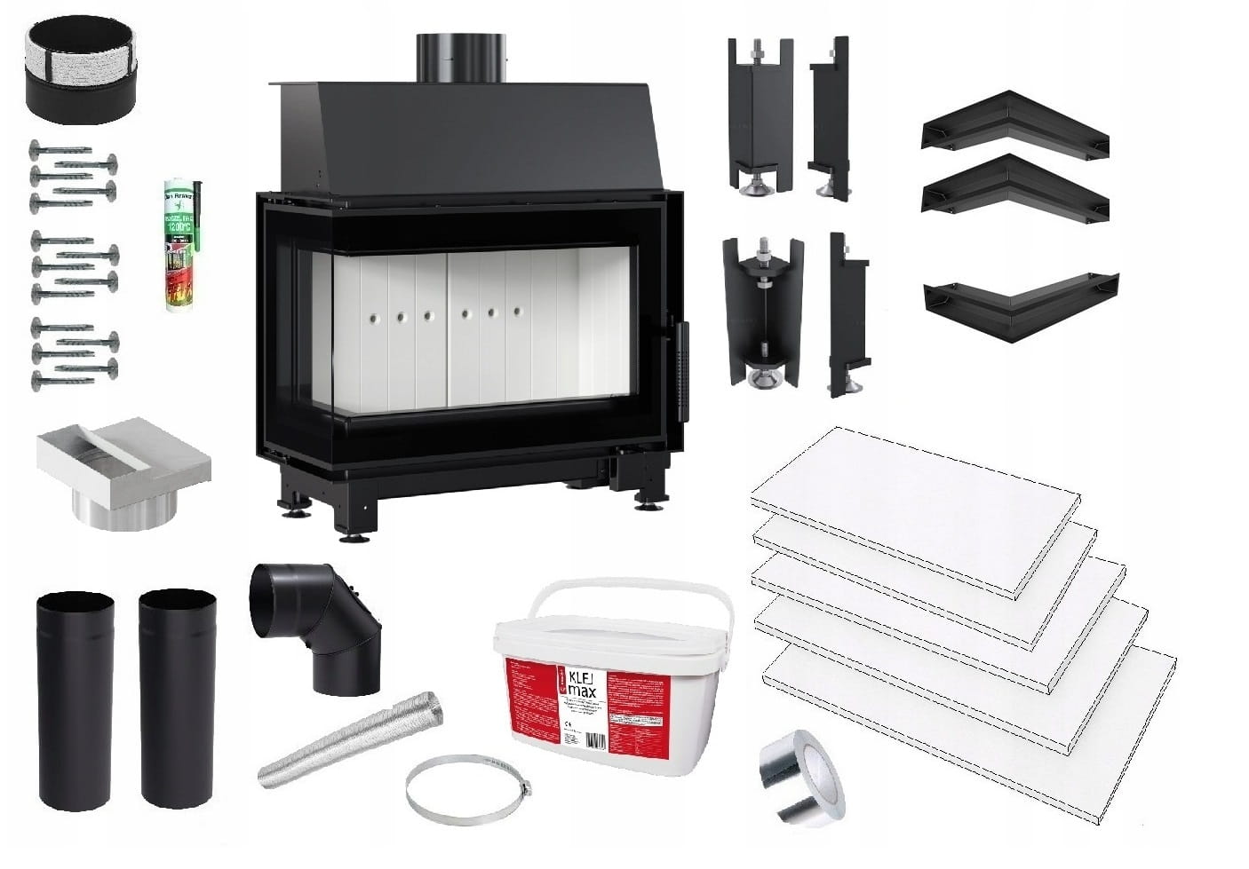 Zestaw 3: Wkład kominkowy powietrzny stalowy Simple S lewy BS + dolot z przejściem na rurę fi 125, termotec, pojedyncza szyba typu glass, wylot fi 150, moc 6 kw + akcesoria