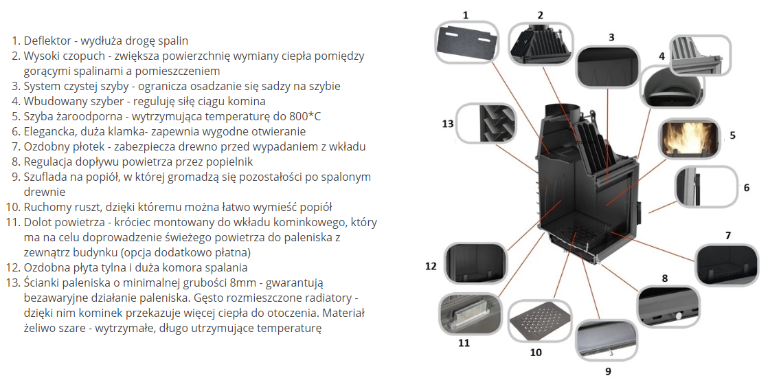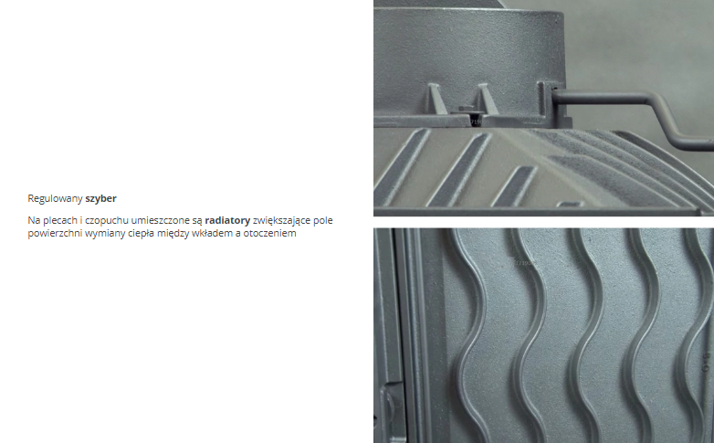 - Ścianki paleniska o minimalnej grubości 8mm - gwarantują bezawaryjne działanie paleniska. Gęsto rozmieszczone radiatory - dzięki nim kominek przekazuje więcej ciepła do otoczenia. Materiał żeliwo szare - wytrzymałe, długo utrzymujące temperaturę