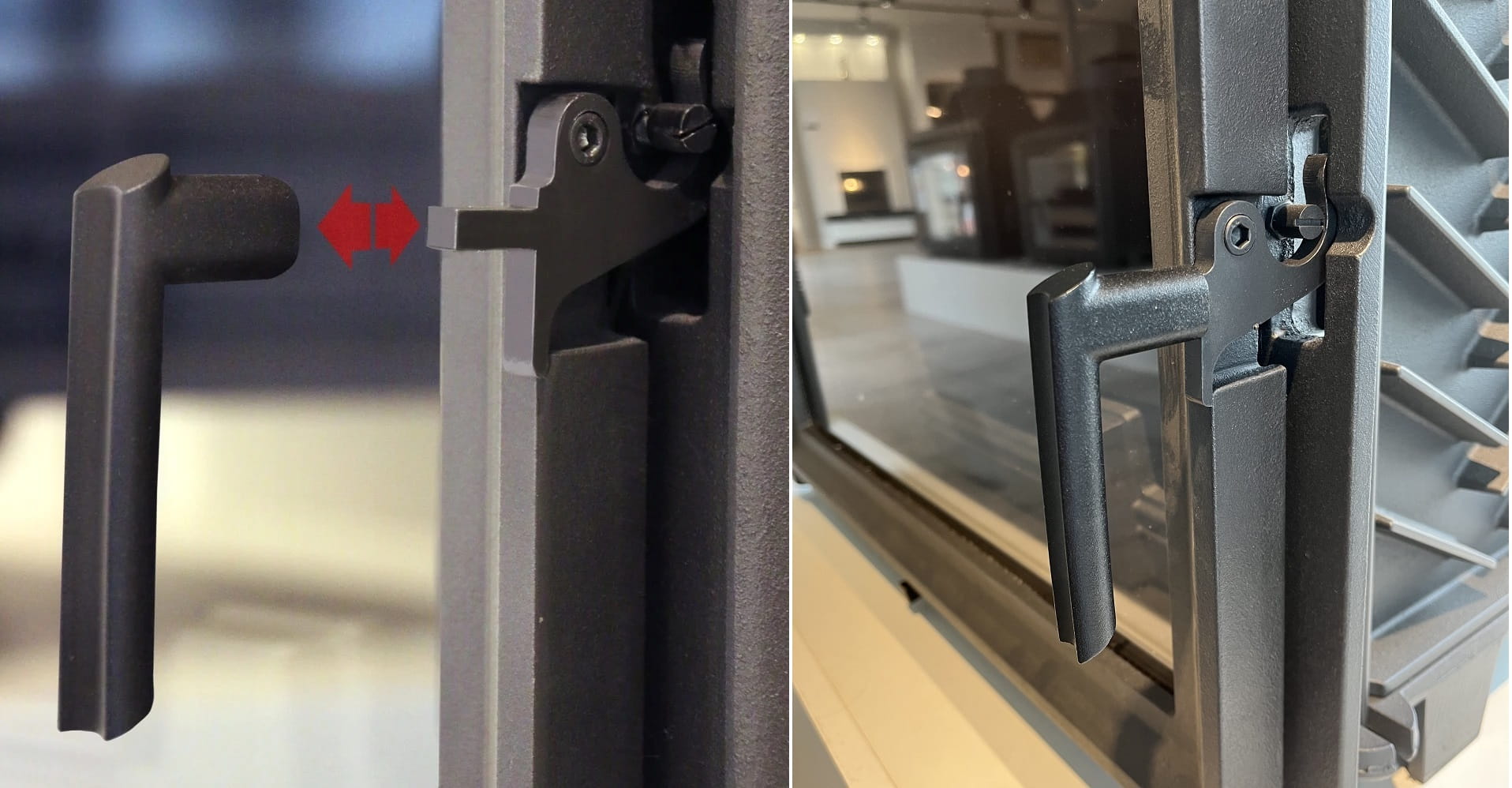 Klamkę w tym wkładzie kominkowym możemy zdjąć podczas palenia, co zapewni, że nie będzie się nagrzewała.