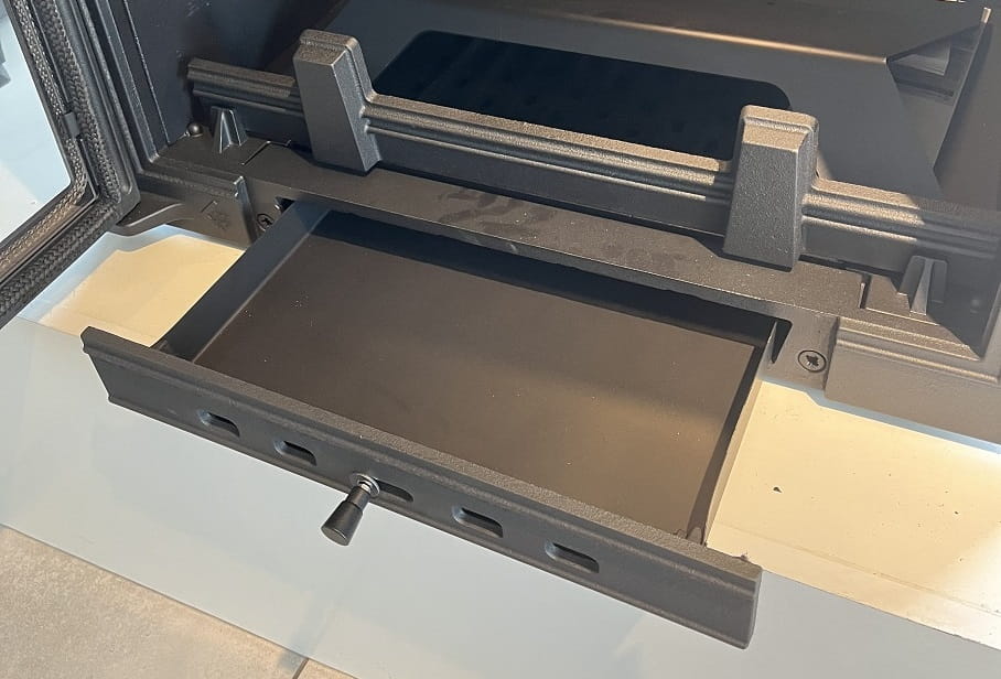 Szuflada/pojemnik na popiół, w których gromadzą się pozostałości po spalonym drewnie oraz ruchomy ruszt, ułatwiający usunięcie popiołu.