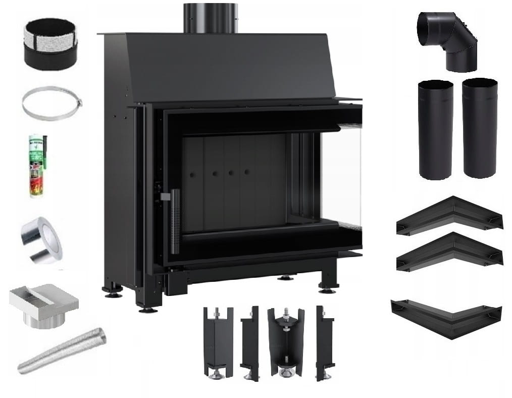Zestaw 4: Wkład kominkowy powietrzny stalowy Simple S prawy BS + dolot z przejściem na rurę fi 125, czarny termotec, pojedyncza szyba typu glass, wylot fi 150, moc 6 kw + akcesoria
