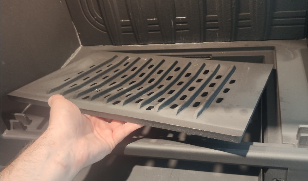 We wkładzie zastosowano solidny, żeliwny ruszt. Można go wyjmować i czyścić.