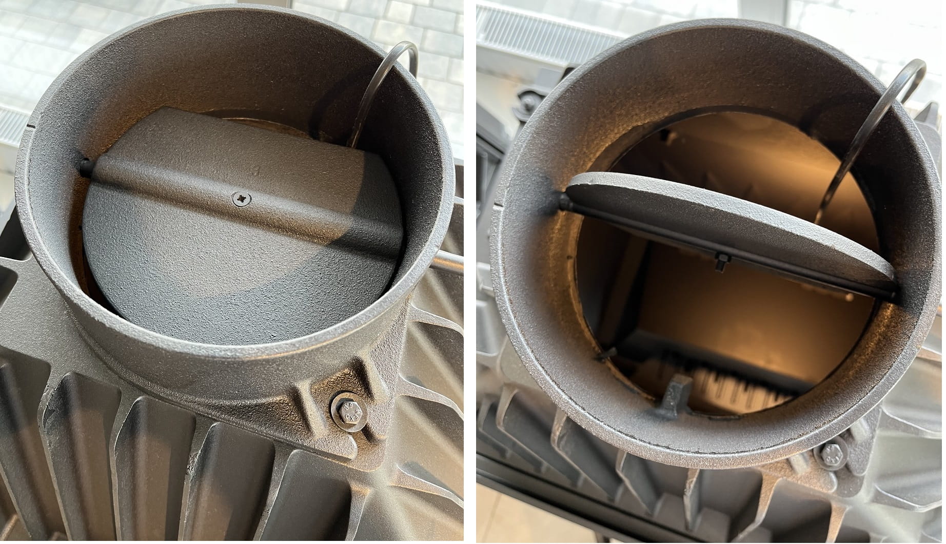 Umożliwia regulację ciągu komina, co wpływa na efektywniejszy proces spalania. Regulacja jest możliwa za pomocą gałki.