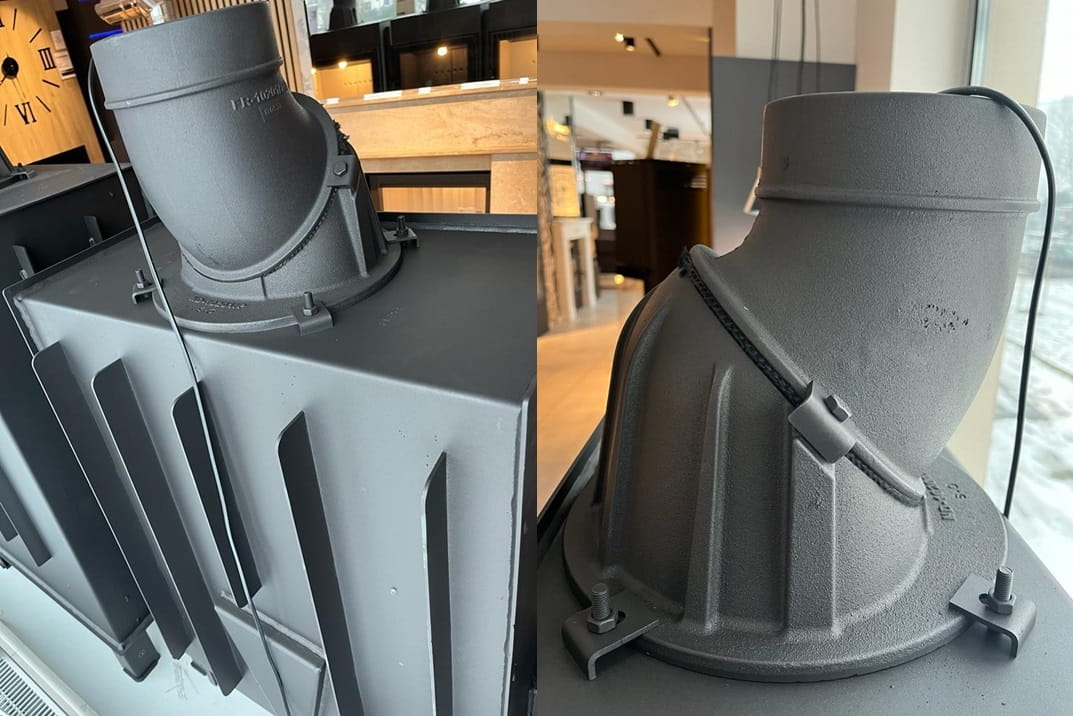 Model wyposażony w ruchomy wylot spalin, dzięki czemu w przypadku montażu, nie ma konieczności zakupu dodatkowych kolan. W łatwy sposób można dostosować kąt podłączenia wkładu do instalacji kominowej.