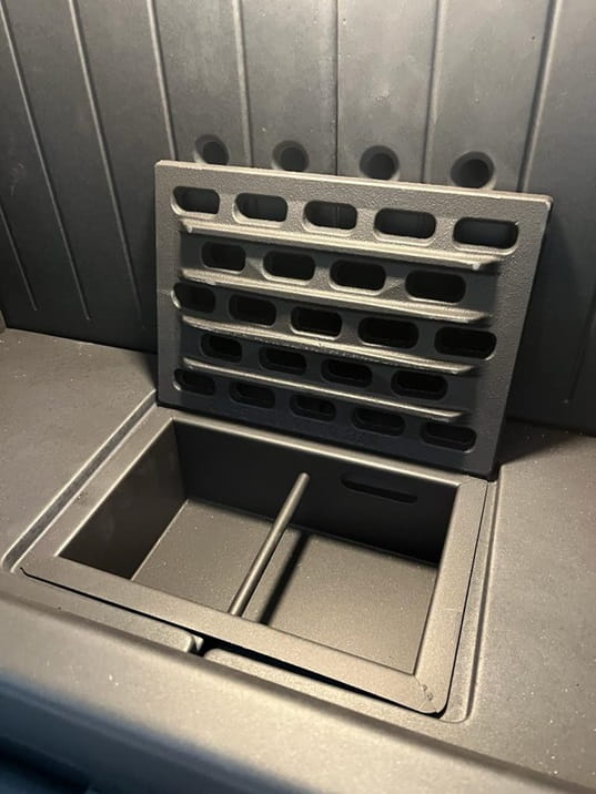 W formie zbiornika umieszczonego poniżej żeliwnego rusztu. Umożliwia wygodne i szybkie usuwanie popiołu z kominka.