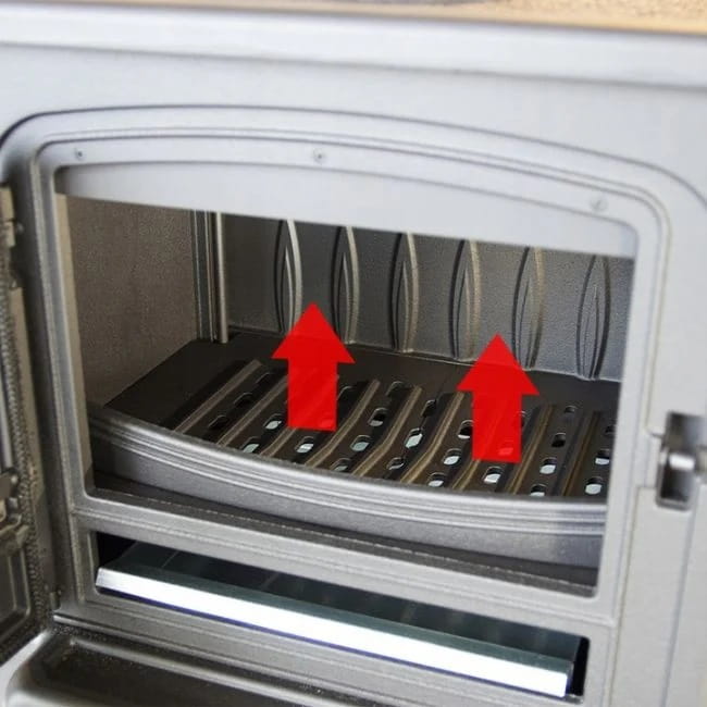 - Szuflada/pojemnik na popiół, w których gromadzą się pozostałości po spalonym drewnie oraz ruchomy ruszt, ułatwiający usunięcie popiołu.