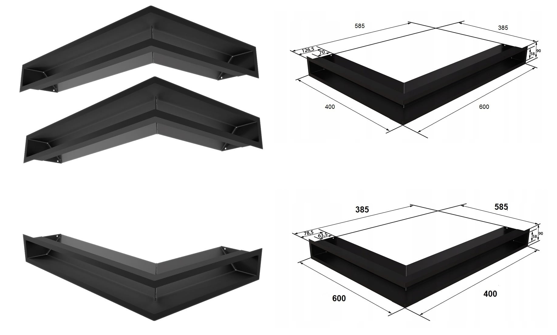 Zestaw 3 szt kratek kominkowych typu luft 45S narożny 600x400x90 do kominka z szybą boczną prawą - kolor czarny - 2szt GÓRA i 1szt DÓŁ S