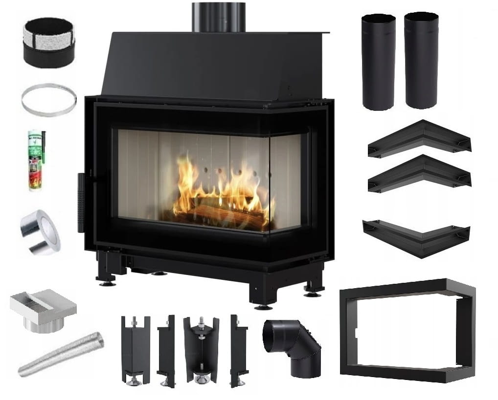 Narożny wkład kominkowy o drzwiach typu BS (szyby łączone). Dzięki takiemu rozwiązaniu możesz podziwiać ogień z dwóch stron w dwóch pomieszczeniach jednocześnie. Idealne rozwiązanie do łączonych pomieszczeń.