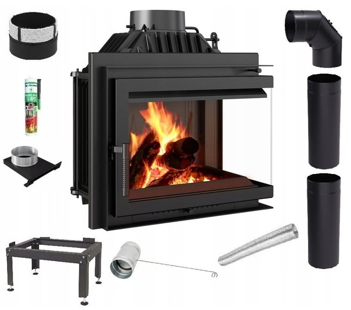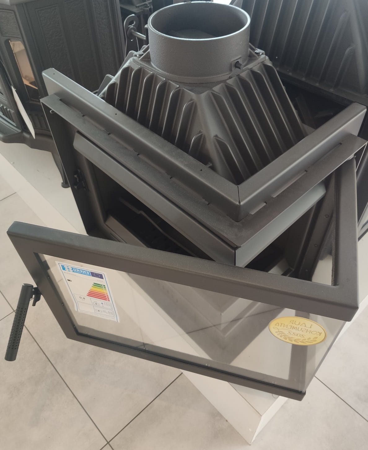 Narożny wkład kominkowy o drzwiach typu BS (szyby łączone). Dzięki takiemu rozwiązaniu możesz podziwiać ogień z dwóch stron w dwóch pomieszczeniach jednocześnie. Idealne rozwiązanie do łączonych pomieszczeń.