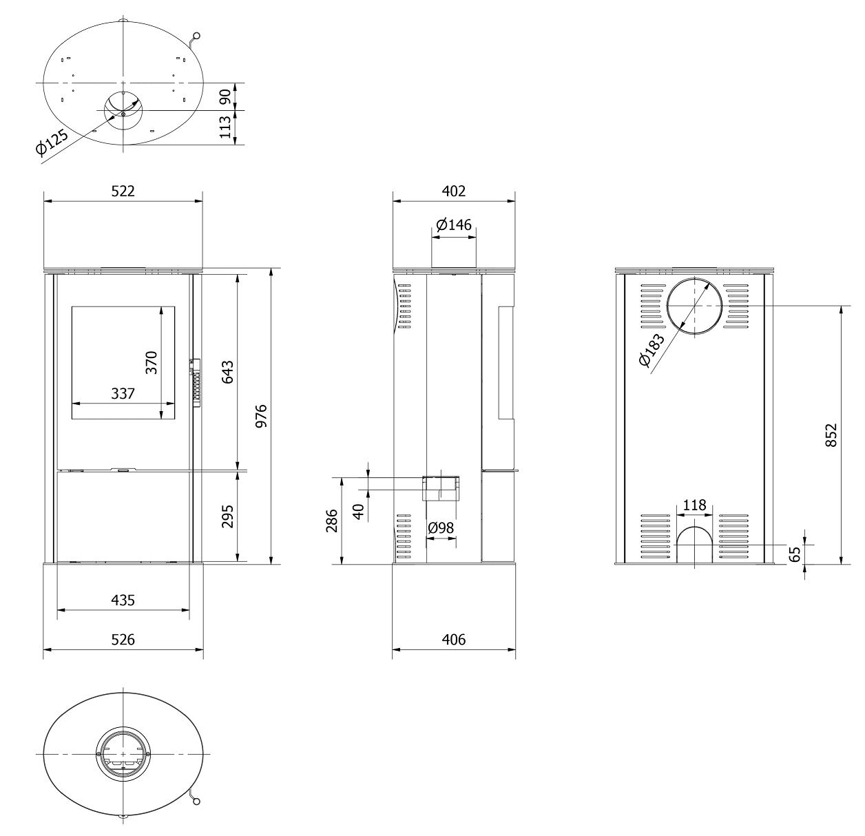 - Regulowany wylot spalin: montażowych, z tyłu lub na górze pieca