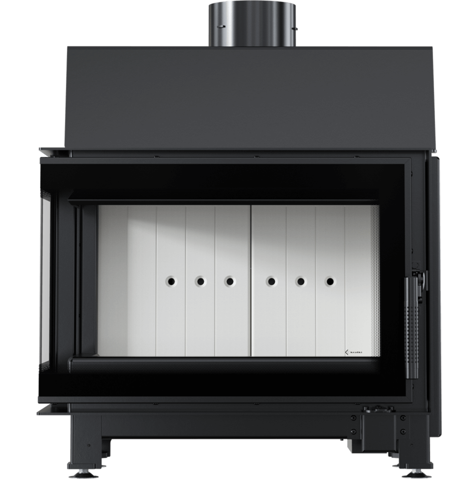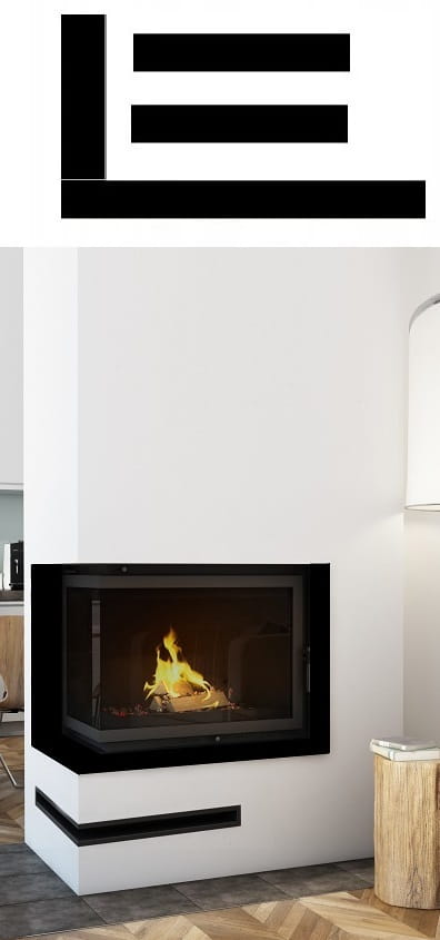 Narożny wkład kominkowy o drzwiach typu BS (szyby łączone). Dzięki takiemu rozwiązaniu możesz podziwiać ogień z dwóch stron w dwóch pomieszczeniach jednocześnie. Idealne rozwiązanie do łączonych pomieszczeń.