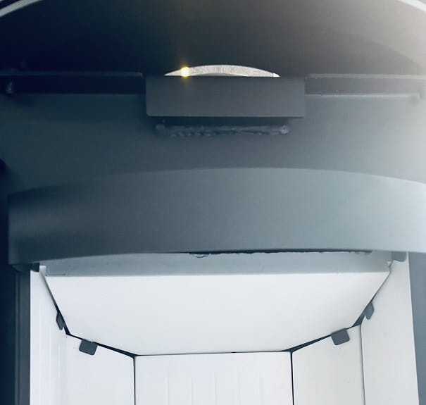 Wbudowany dolot powietrza z zewnątrz fi 100, który zapewnia doprowadzenie świeżego powietrza do paleniska z zewnątrz budynku, co wpływa na lepsze spalanie i większy komfort użytkowania.
