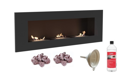 biokominek DELTA 3 czarny 1200x400 z 3 biowkładkami z certyfikatem TÜV + czerwone kamyki