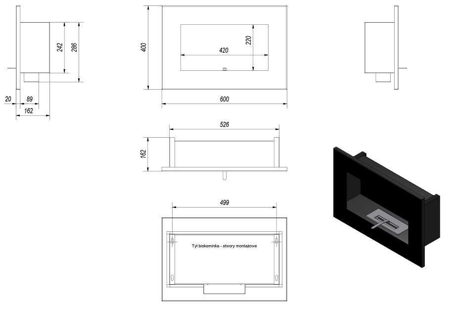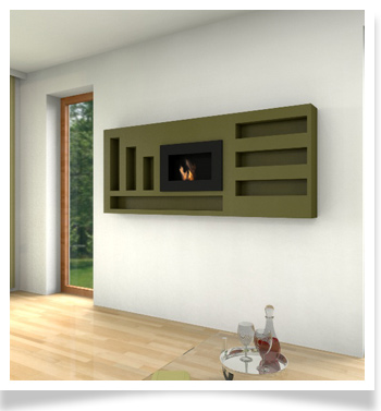 - indywidualna zabudowa: można zamontować we wnęce lub na specjalnie zbudowanym do tego celu elemencie dekoracyjnym wystającym ze ściany. Dylatacja: bezpieczna odległość od ściany (1,5 cm) pozwala na obieg powietrza wokół biokominka, bez dodatkowych listew montażowych.