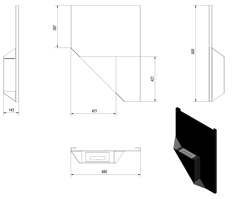 - indywidualna zabudowa: można zamontować na specjalnie zbudowanym do tego celu elemencie dekoracyjnym wystającym ze ściany. Dylatacja: bezpieczna odległość od ściany (1,5 cm) pozwala na obieg powietrza wokół biokominka, bez dodatkowych listew montażowych.