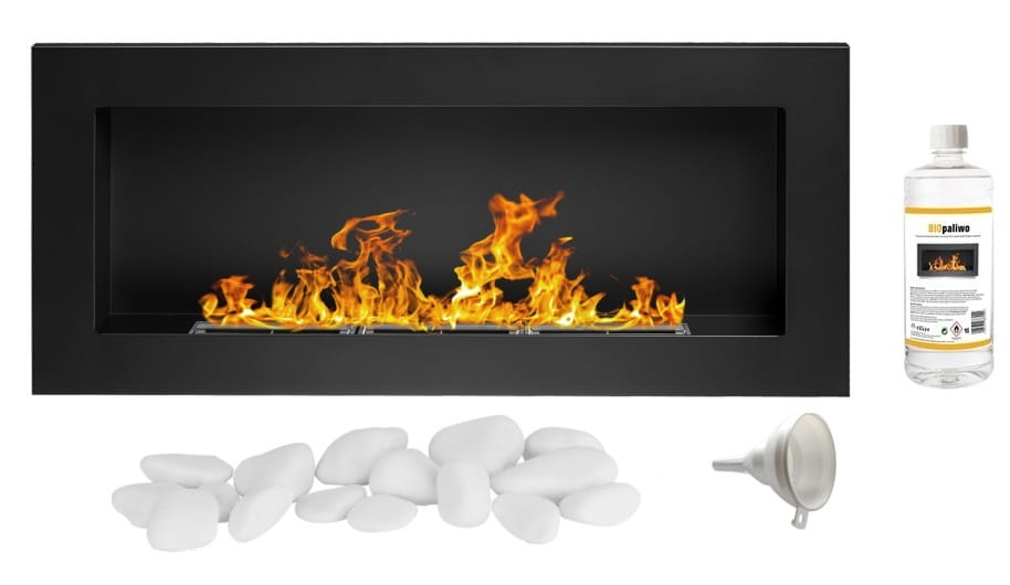 Do wyposażenia biokominka należy także: 1 kg kamieni ozdobnych, lejek do nalewania biopaliwa, uchwyt do wygaszenia płomienia.