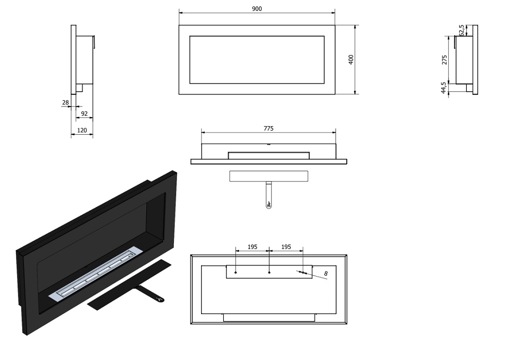 Sposób montażu: naścienny lub indywidualna zabudowa - Montaż biokominka w zabudowie musi zostać przeprowadzony w taki sposób, aby zawsze była możliwość demontażu urządzenia bez ingerencji w zabudowę.