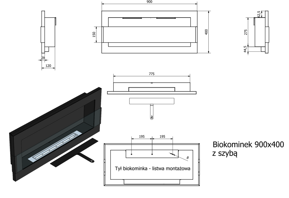 Podobnie jak przy innych modelach tak i tu zadbano o prosty i szybki montaż produktu. Biokominek zawieszany jest za pomocą dołączonej do zestawu listwy montażowej.