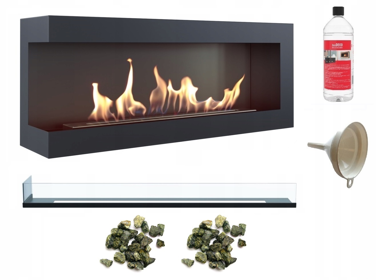 biokominek narożny DELTA lewa 1200 czarny z szybą z certyfikatem TÜV + kamyki zielone