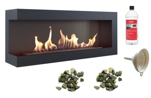 biokominek narożny DELTA lewa 1200x280 czarny z certyfikatem TÜV + zielone kamyki