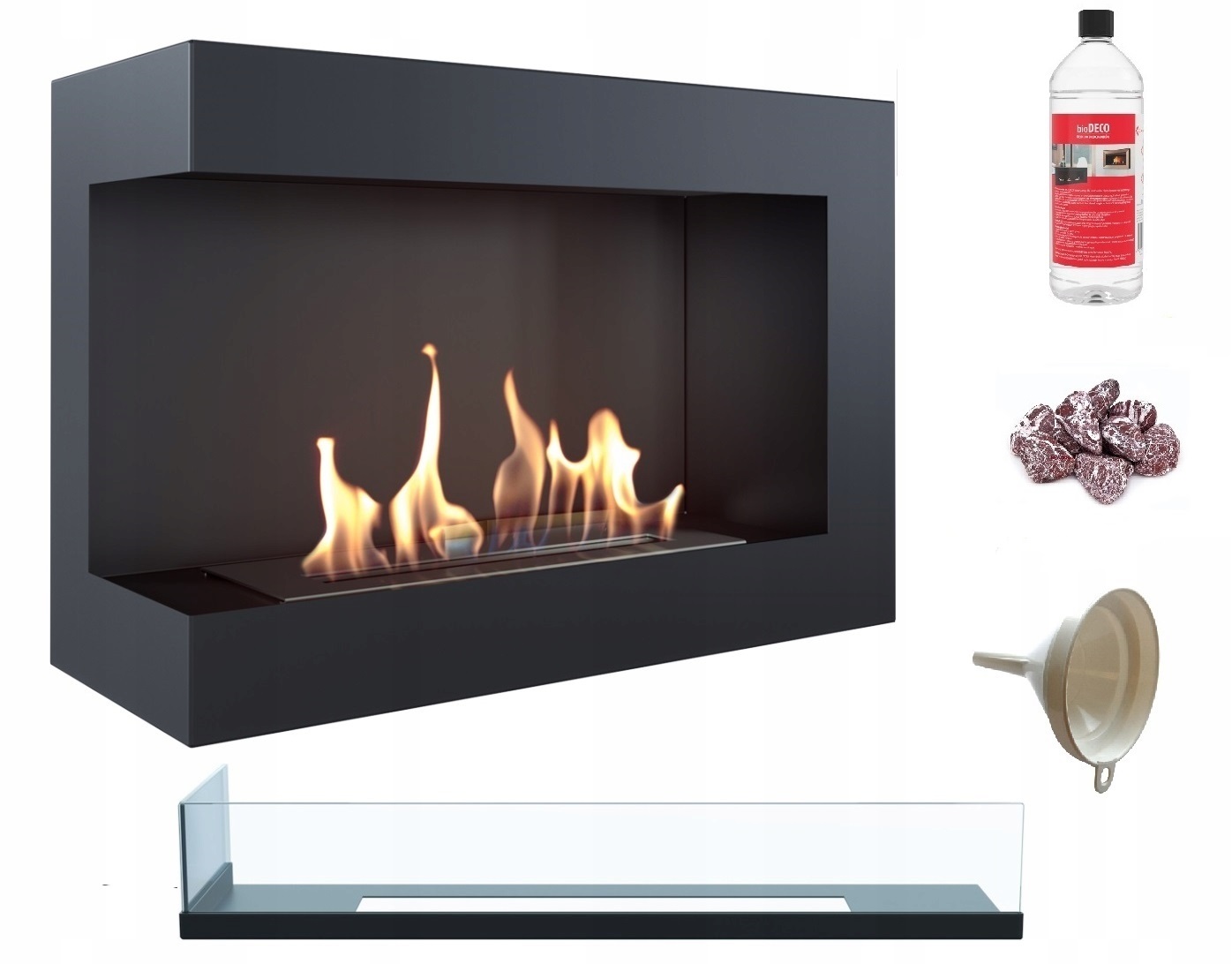 biokominek narożny DELTA lewa 700 czarny z szybą z certyfikatem TÜV + kamyki czerwone