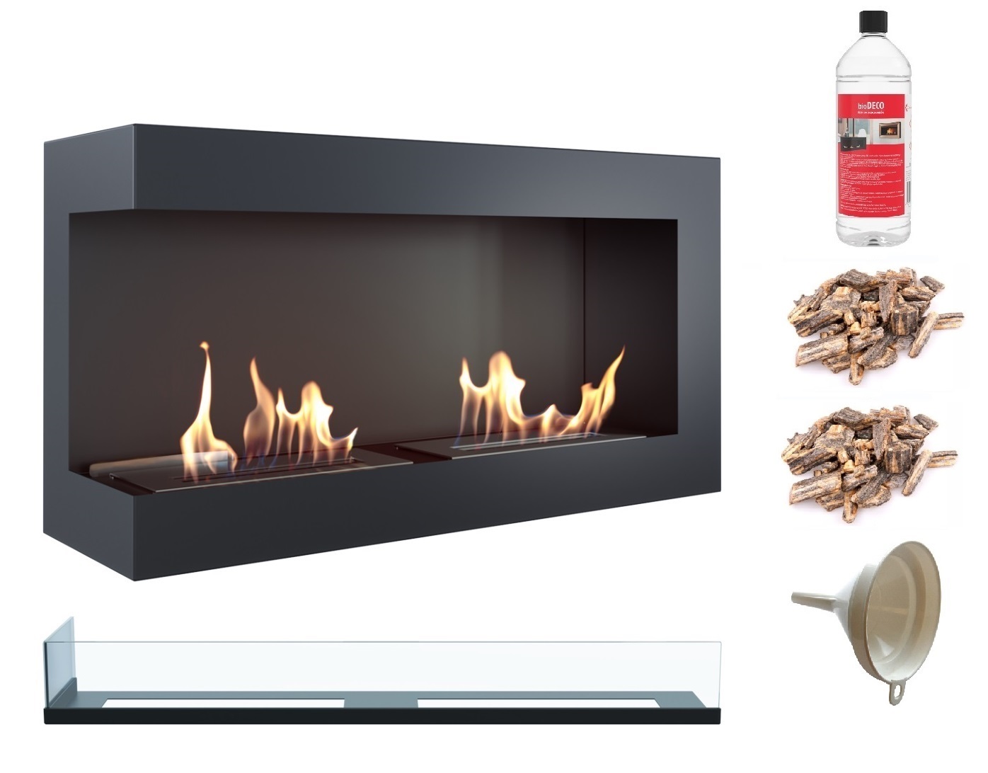 biokominek narożny DELTA lewa 900 czarny z szybą z certyfikatem TÜV + kamyki brązowe