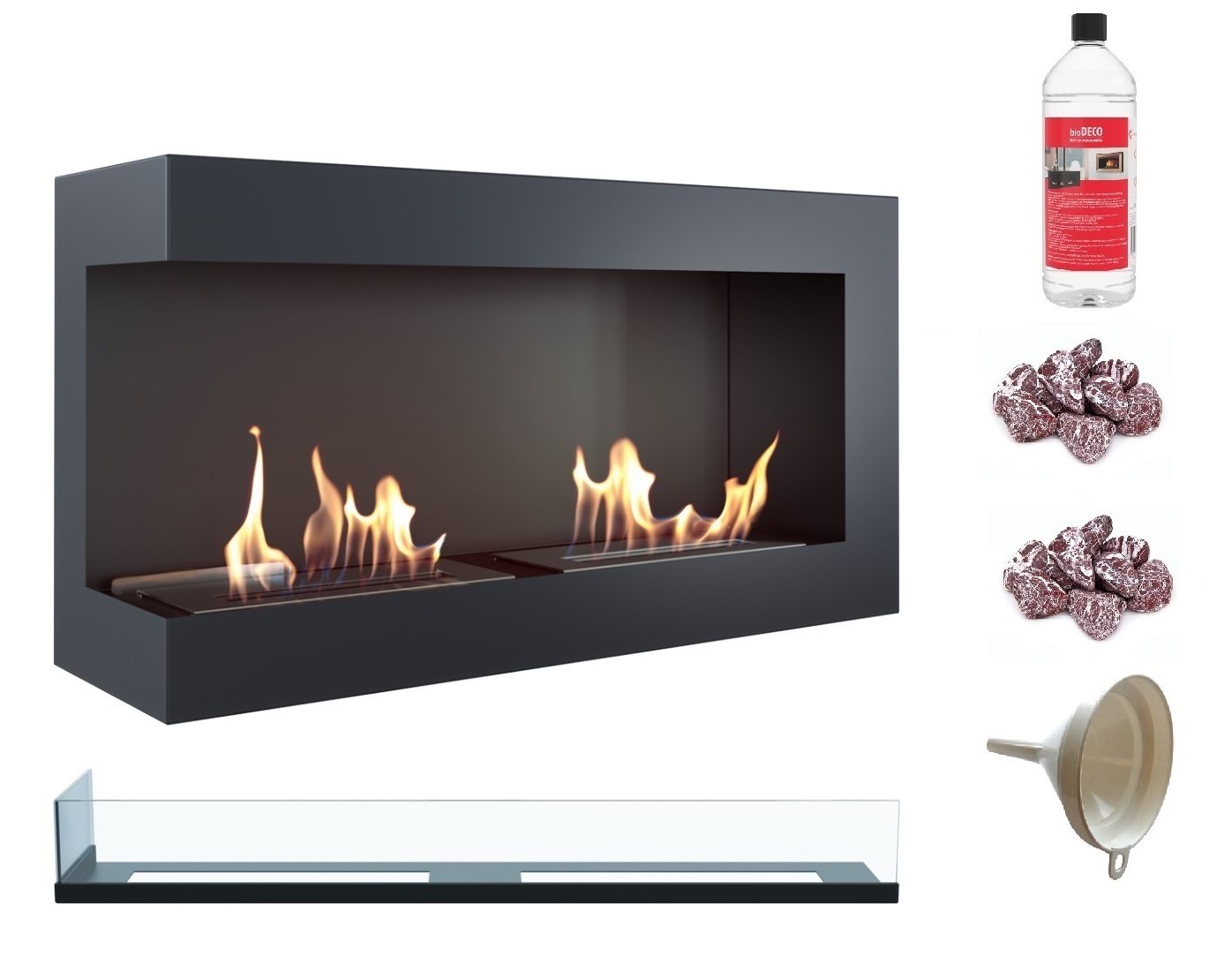 biokominek narożny DELTA lewa 900 czarny z szybą z certyfikatem TÜV + kamyki czerwone