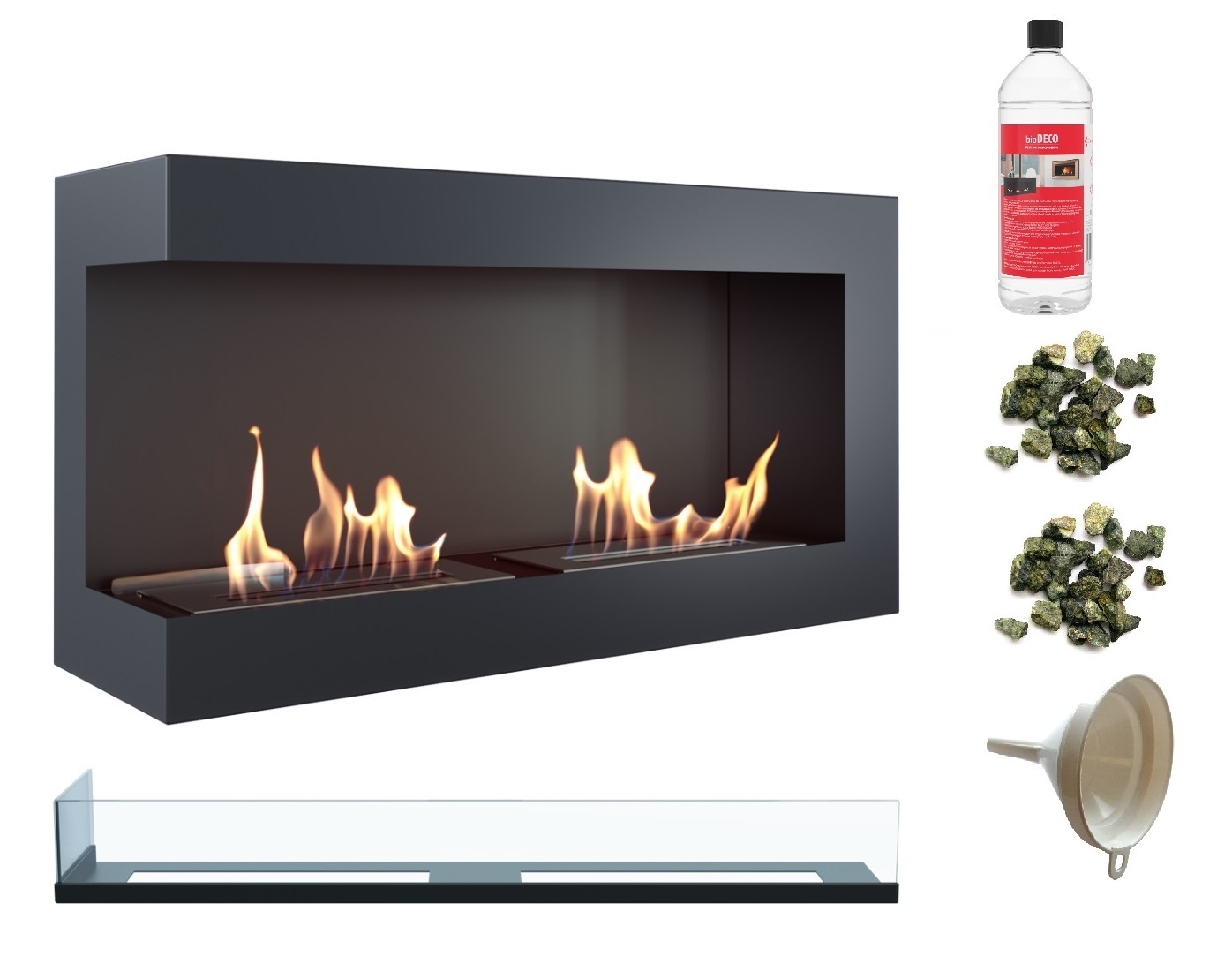 biokominek narożny DELTA lewa 900 czarny z szybą z certyfikatem TÜV + kamyki zielone