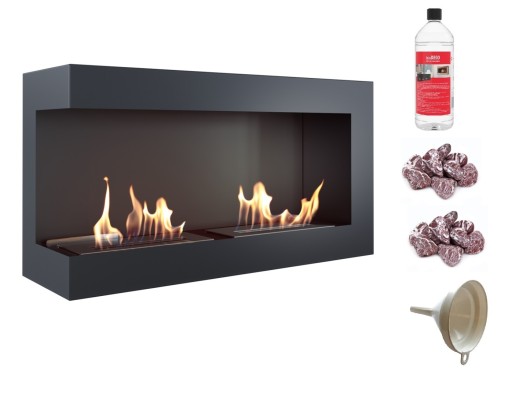 biokominek narożny DELTA lewa 900x280 czarny z certyfikatem TÜV + czerwone kamyki