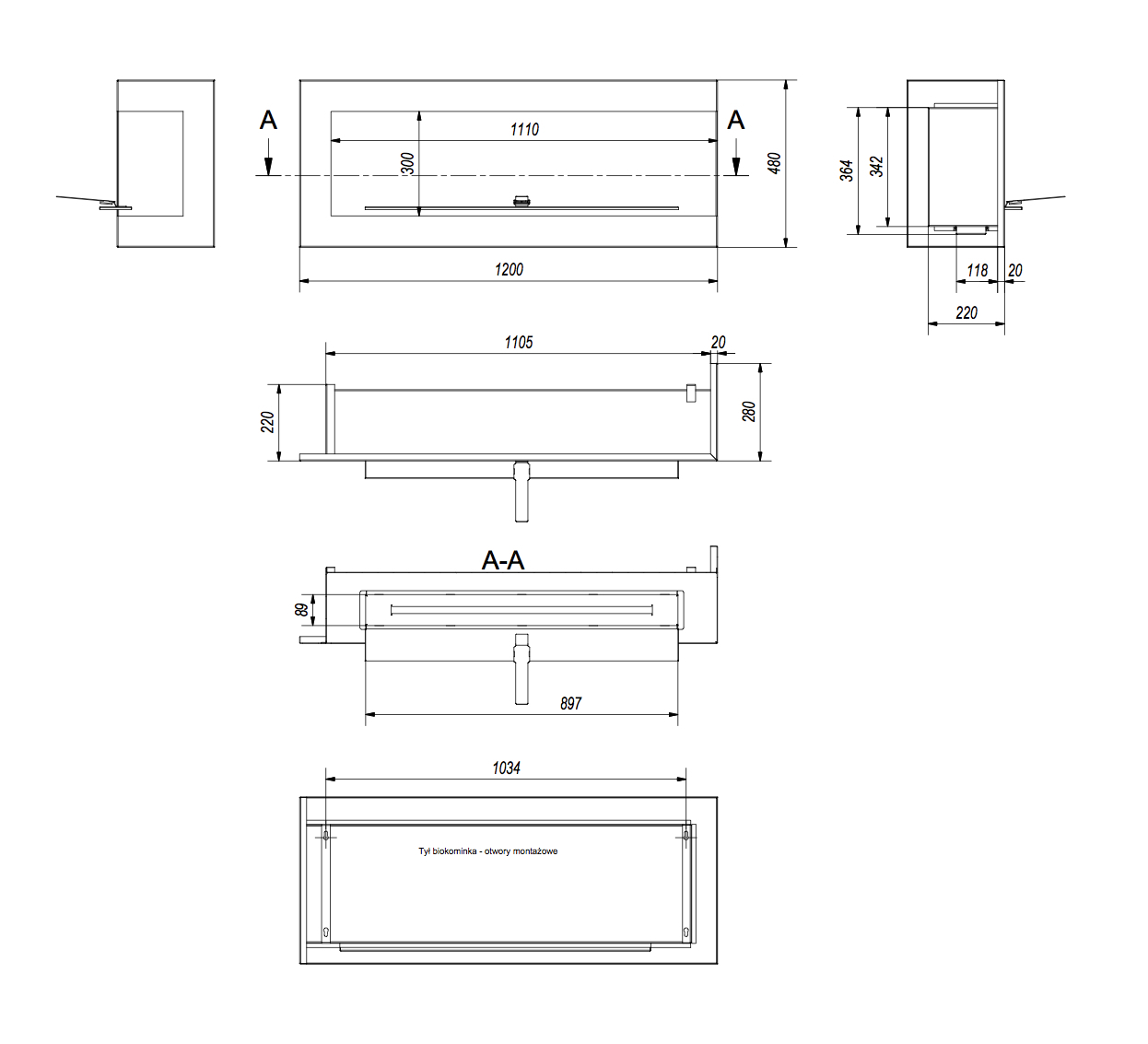 Indywidualna zabudowa - wymiary wnęki pod zabudowę: (szerokość x wysokość x głębokość) 1105 x 366 x 200 mm