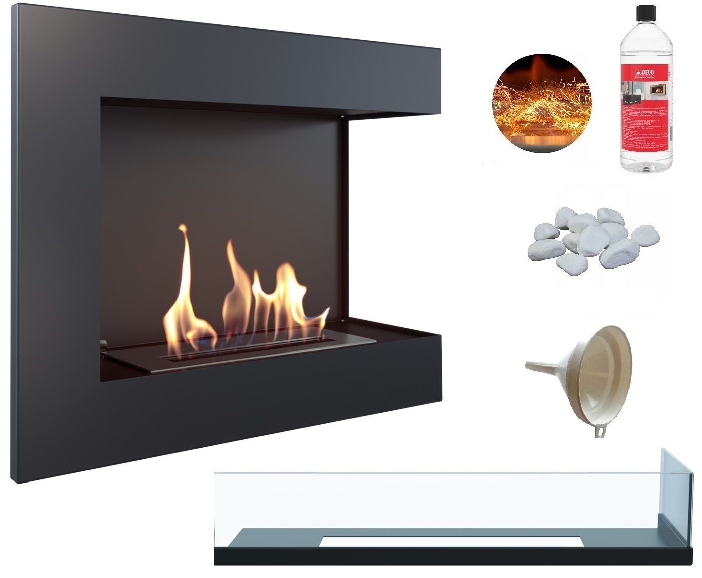 biokominek narożny DELTA prawa 600 czarny z szybą z certyfikatem TÜV + efekt żarzenia