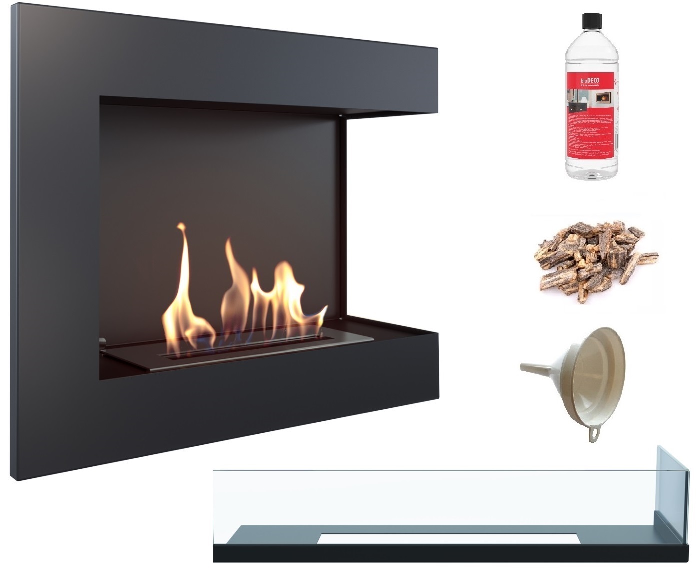 biokominek narożny DELTA prawa 600 czarny z szybą z certyfikatem TÜV + kamyki brązowe