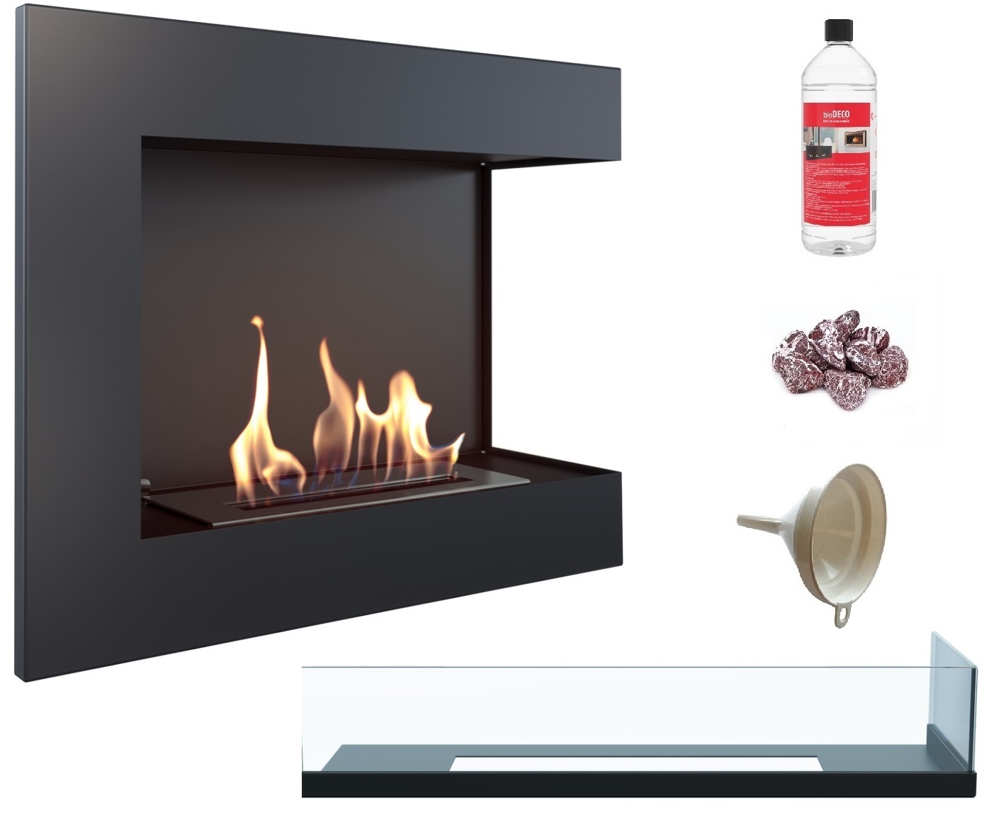 biokominek narożny DELTA prawa 600 czarny z szybą z certyfikatem TÜV + kamyki czerwone