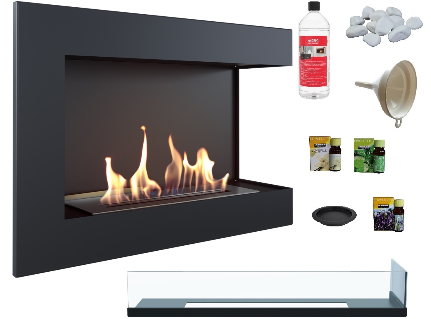 biokominek narożny DELTA prawa 700 czarny z szybą z certyfikatem TÜV + aromaterapia 3 olejki