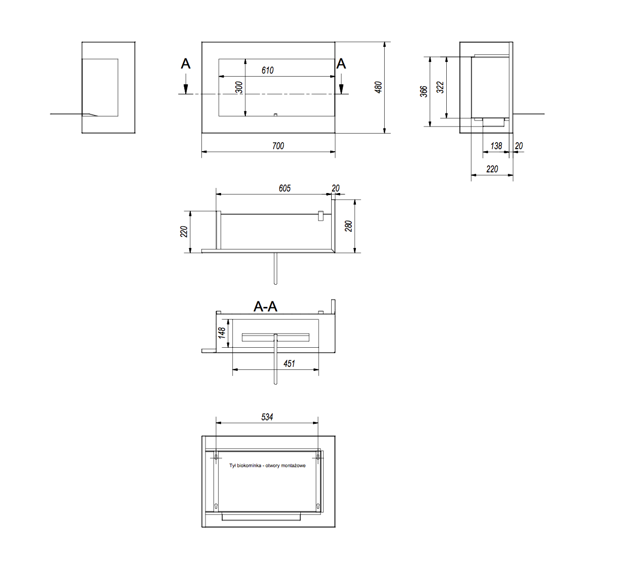 - narożny / indywidualna zabudowa: można zamontować we wnęce lub na specjalnie zbudowanym do tego celu elemencie dekoracyjnym wystającym ze ściany. Dylatacja: bezpieczna odległość od ściany (1,5 cm) pozwala na obieg powietrza wokół biokominka, bez dodatkowych listew montażowych.