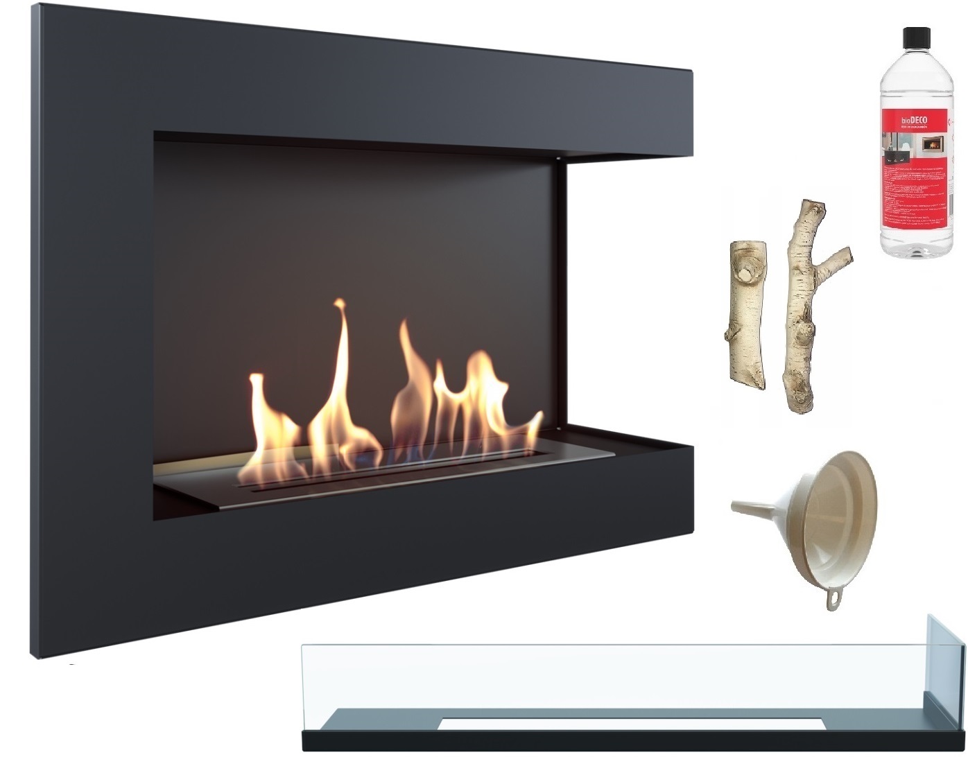biokominek narożny DELTA prawa 700 czarny z szybą z certyfikatem TÜV + drewienka ceramiczne