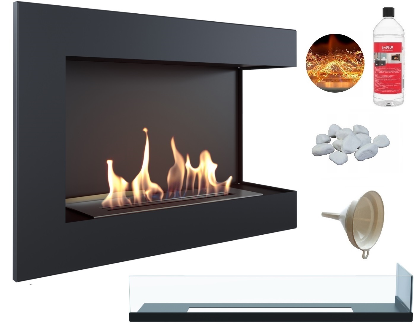 biokominek narożny DELTA prawa 700 czarny z szybą z certyfikatem TÜV + efekt żarzenia