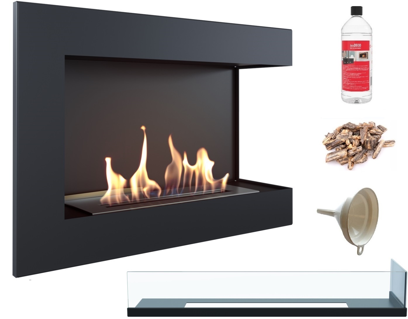 biokominek narożny DELTA prawa 700 czarny z szybą z certyfikatem TÜV + kamyki brązowe