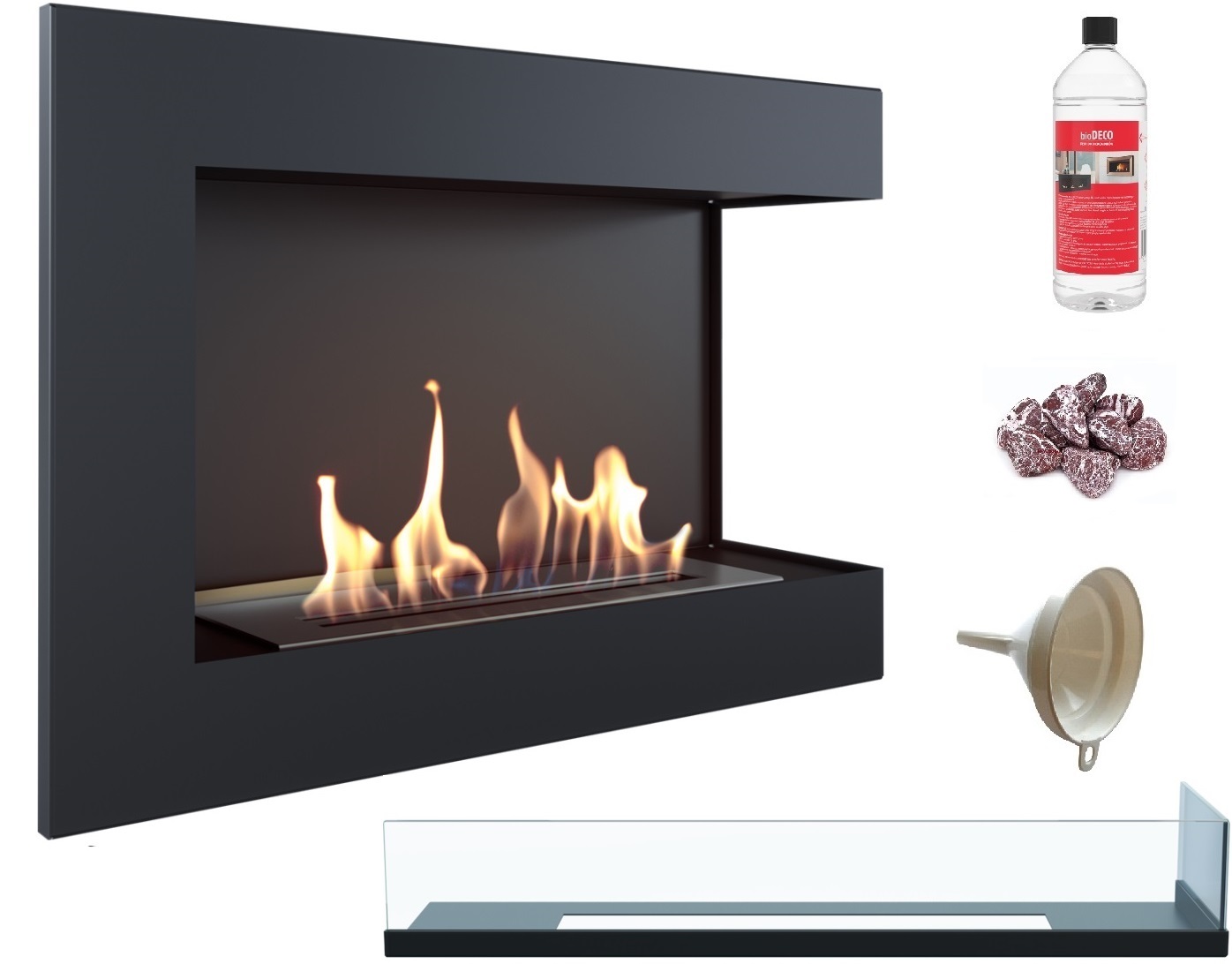 biokominek narożny DELTA prawa 700 czarny z szybą z certyfikatem TÜV + kamyki czerwone