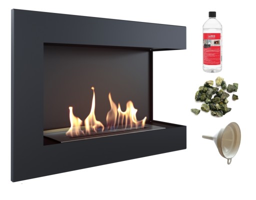 biokominek narożny DELTA prawa 700x280 czarny z certyfikatem TÜV + zielone kamyki