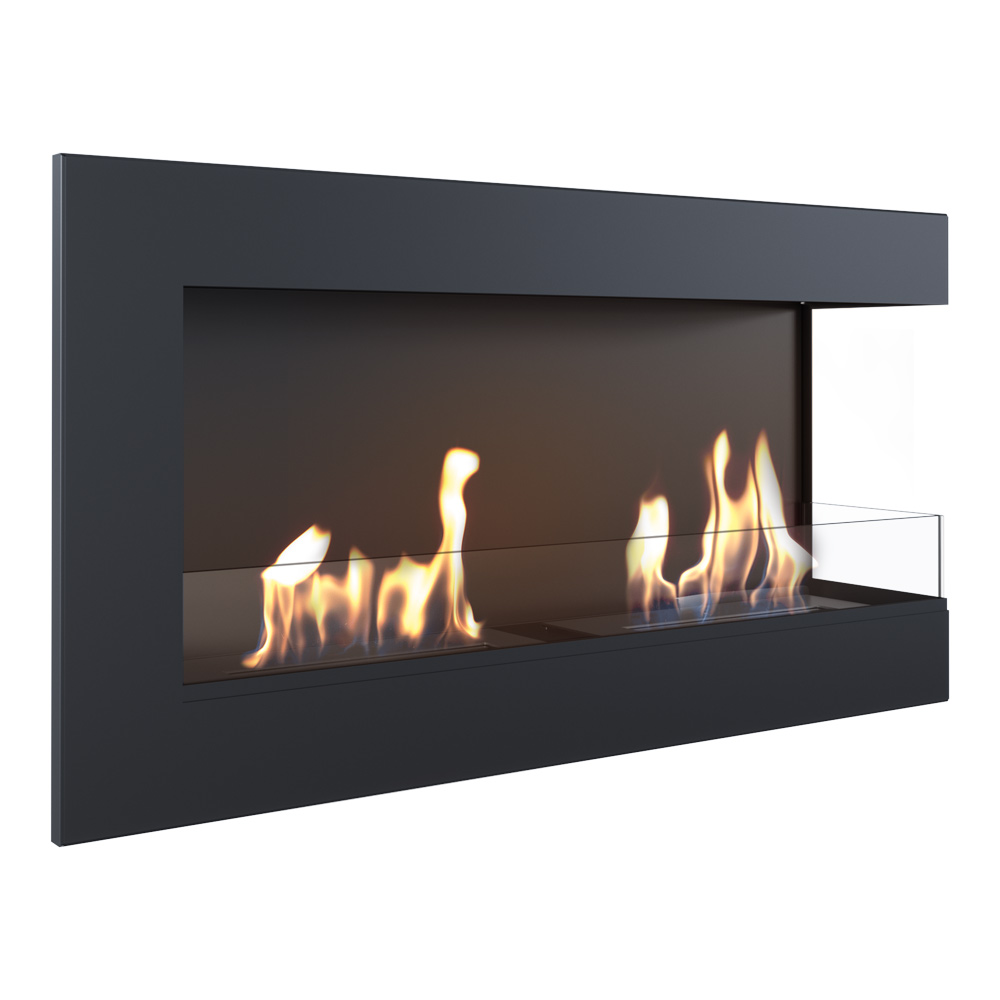 Narożny biokominek otwarty jest idealnym rozwiązaniem do zabudowy we wnęce. Dzięki dwustronnej wizji ognia, panoramicznemu wyglądowi i delikatnej ramie frontowej, doskonale wpisuje się w stylistykę nowoczesnych wnętrz.