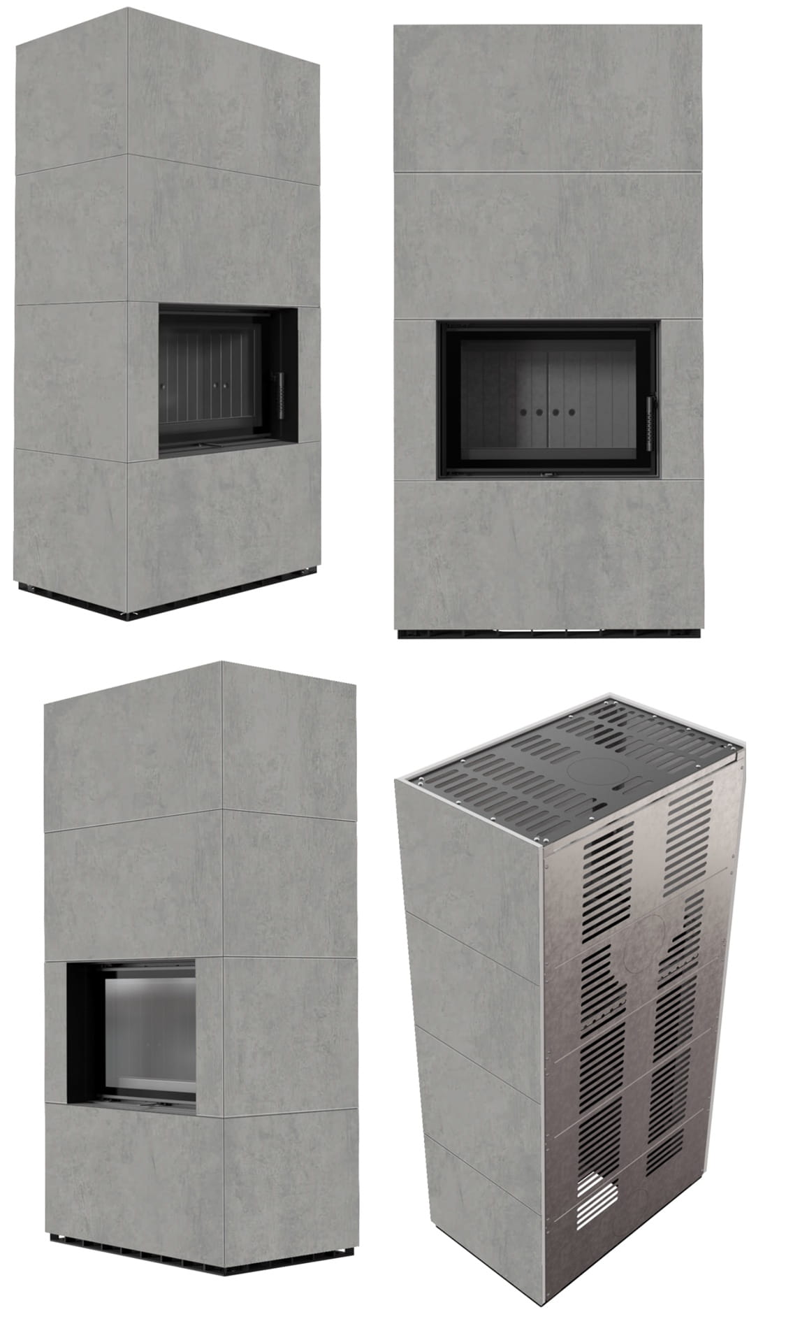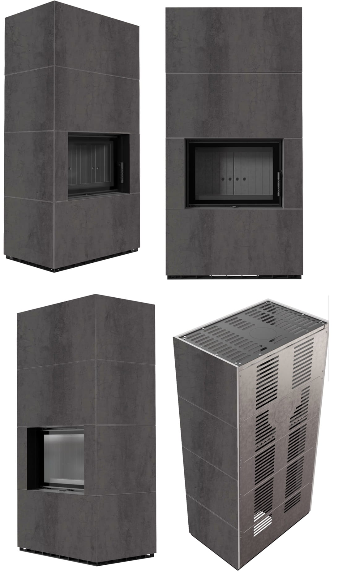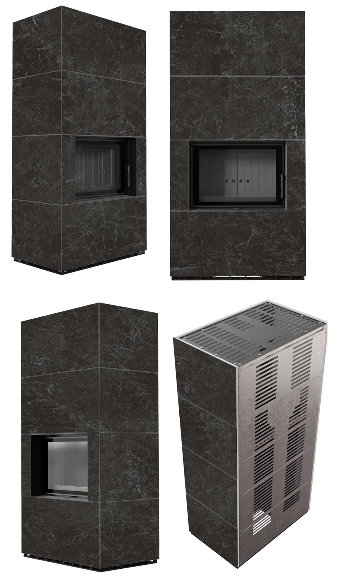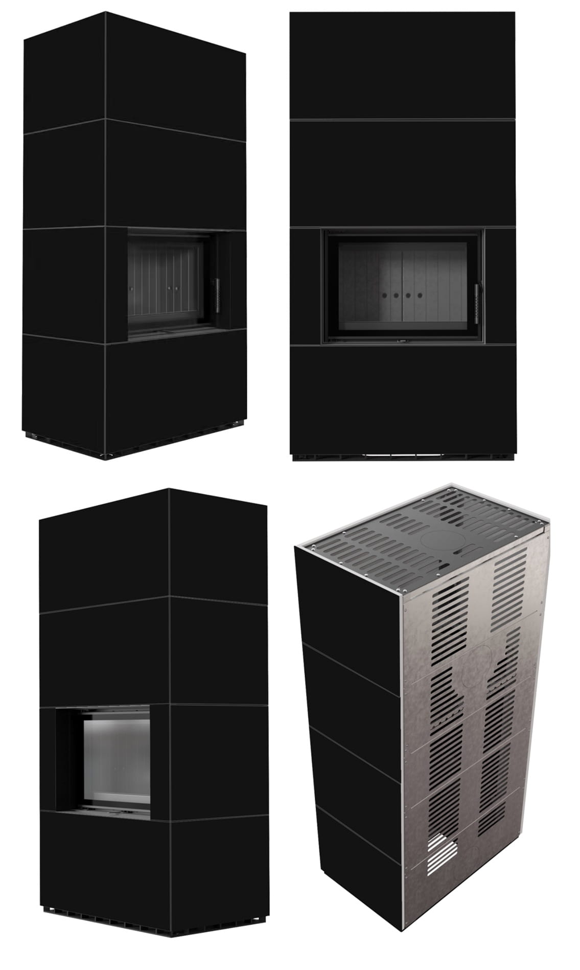 kominek modułowy powietrzny stalowy Floki S BOX z czarnym termotec + dolot, zabudowa ze spieku, wylot fi 160, moc 8 kW