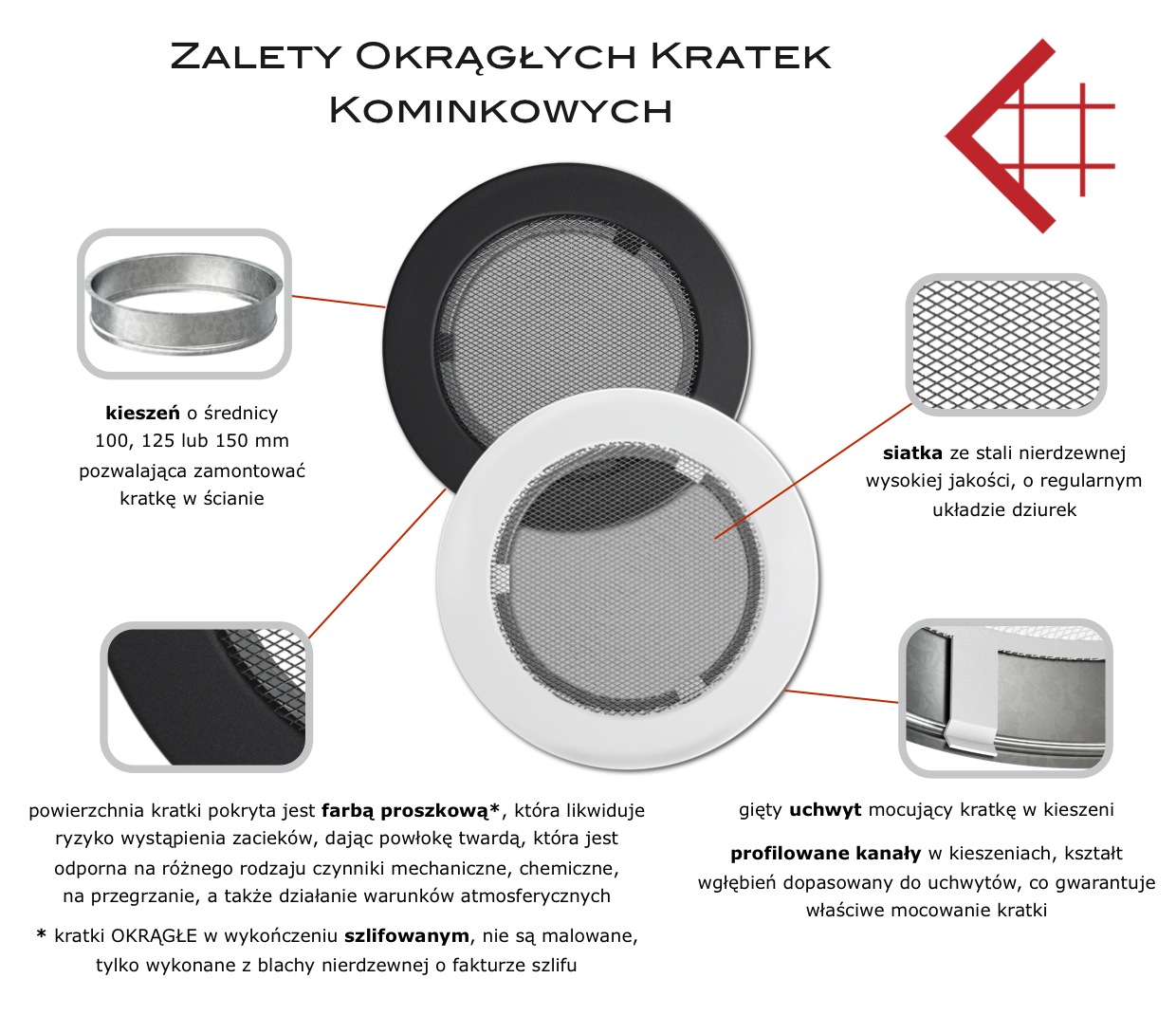 Kratka kominkowa to zakończenie kanału ciepłego powietrza rozprowadzanego w sposób grawitacyjny lub mechaniczny z kominka. Jest ona montowana w ścianie lub w czopuchu obudowy kominkowej. Kratki malowane są metodą proszkową, która charakteryzuje się trwałością koloru oraz odpornością termiczną. Dodatkowo farba  zabezpiecza kratki przed uszkodzeniami mechanicznymi. Każda z kratek wyposażona jest w kieszeń, wykonaną z blachy ocynkowanej.