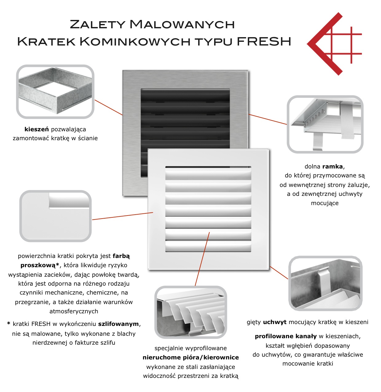 Dzięki malowaniu kratki metodą proszkową, jej kolor pozostaje trwały i odporny na działanie podwyższonej temperatury, a sama kratka jest bardziej odporna na uszkodzenia mechaniczne.