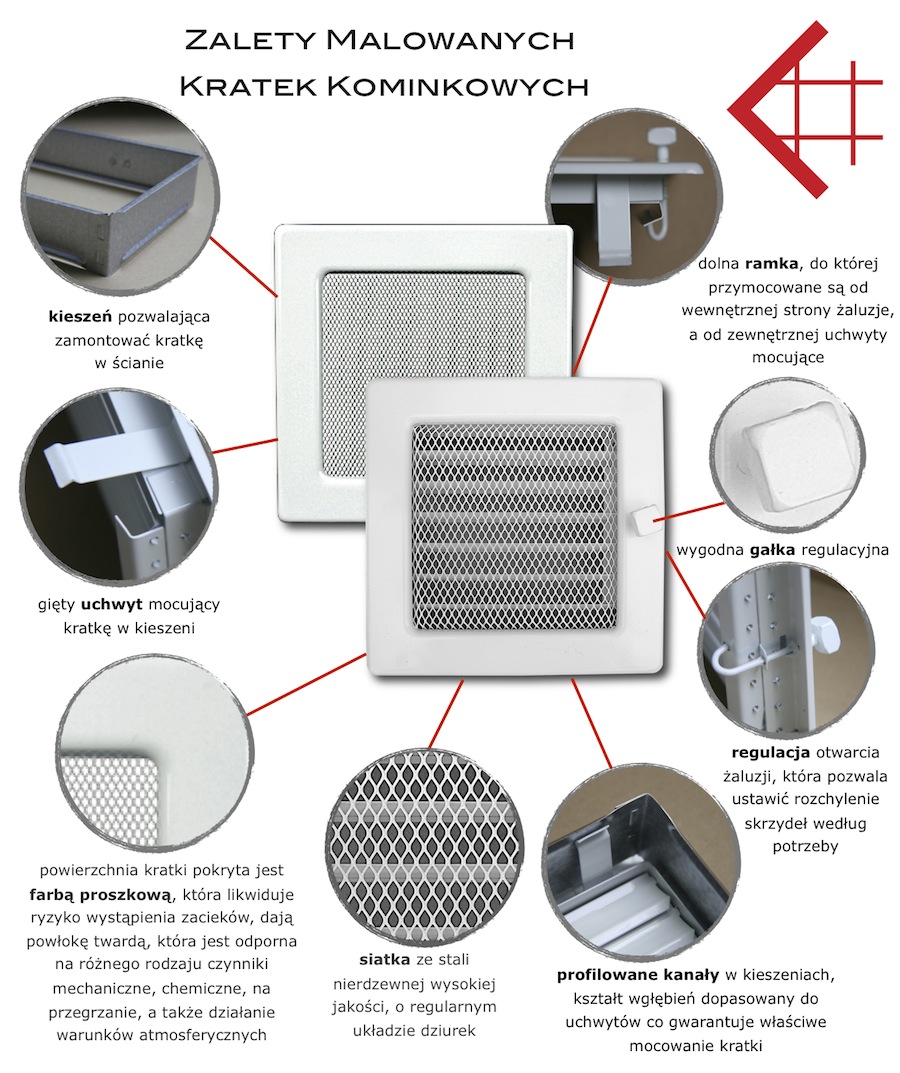 Kratki malowane są metodą proszkową, która charakteryzuje się trwałością koloru oraz odpornością termiczną. Dodatkowo farba zabezpiecza kratki przed uszkodzeniami mechanicznymi