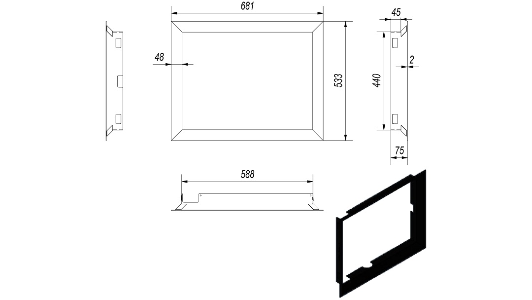 Nowoczesna stalowa ramka ozdobna do wkładu kominkowego powietrznego i z płaszczem wodnym MBM 10 z prostym frontem.