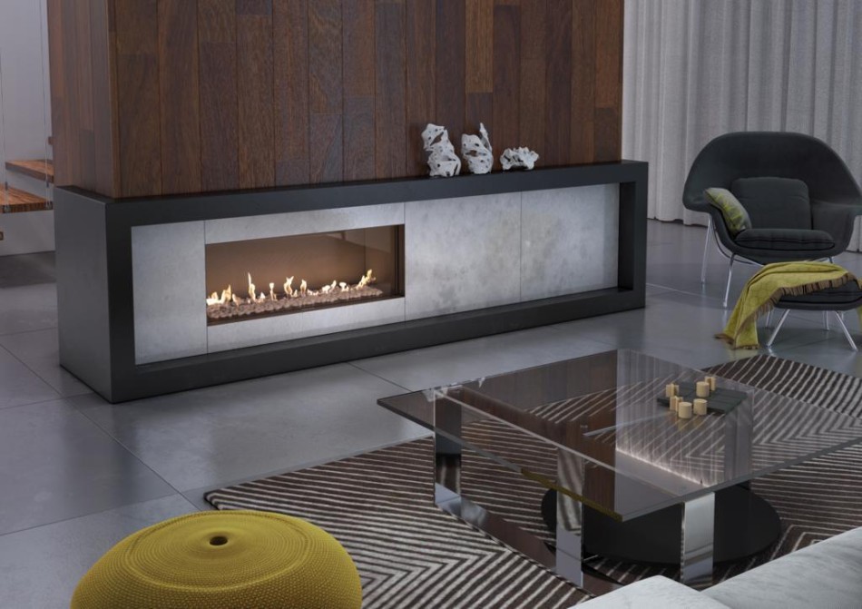 1. Nowoczesny, elegancki kominek gazowy do zabudowy o horyzontalnej wizji ognia.
