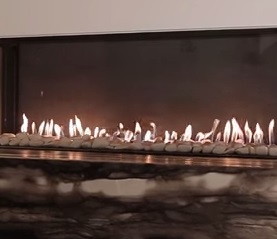 1. Nowoczesny, elegancki kominek gazowy do zabudowy o horyzontalnej wizji ognia.