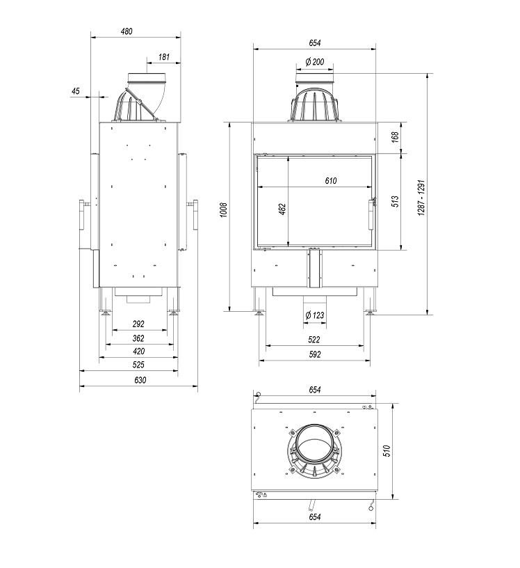 Wkład wyposażony jest w dwoje drzwiczek przednie i tylne (zamiast ściany tylnej), dzięki czemu ciepło promieniuje w dwóch kierunkach.